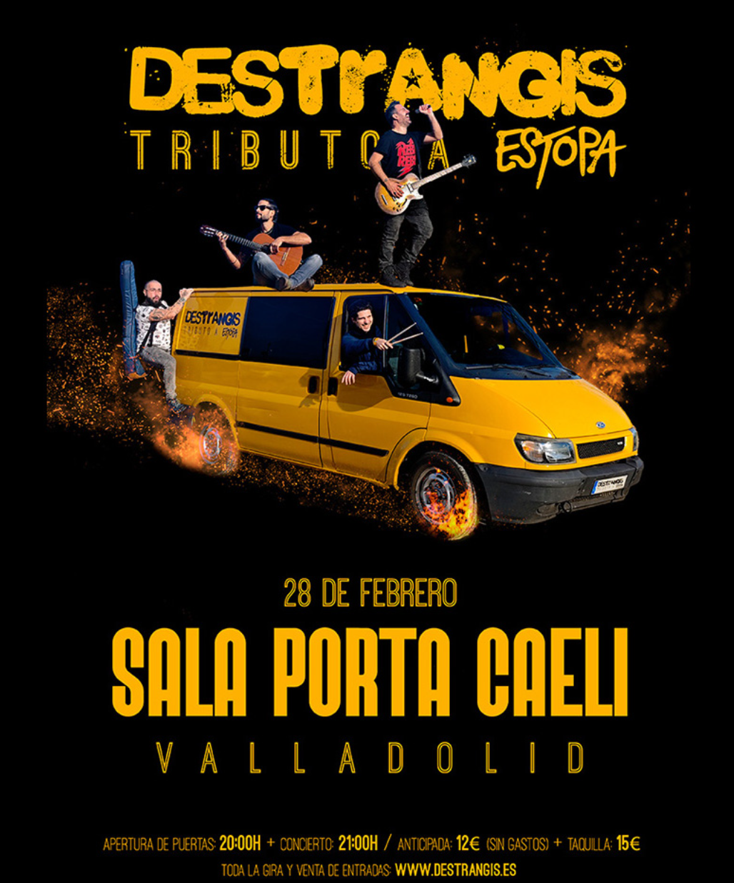 Sala Porta Caeli C. Mariano de los Cobos, 1, 47014 ValladolidDestrangis - Tributo a Estopa en la Sala Porta Caeli, Valladolid (Dirección: C. Mariano de los Cobos, 1) Apertura de puertas: 20:.00h | Concierto: 21:00h Destrangis es la banda Tributo a Estopa pionera y con mayor trayectoria en la actualidad. Fundada en 2013, ha logrado un impresionante número de más de 750 bolos, recorriendo gran ...