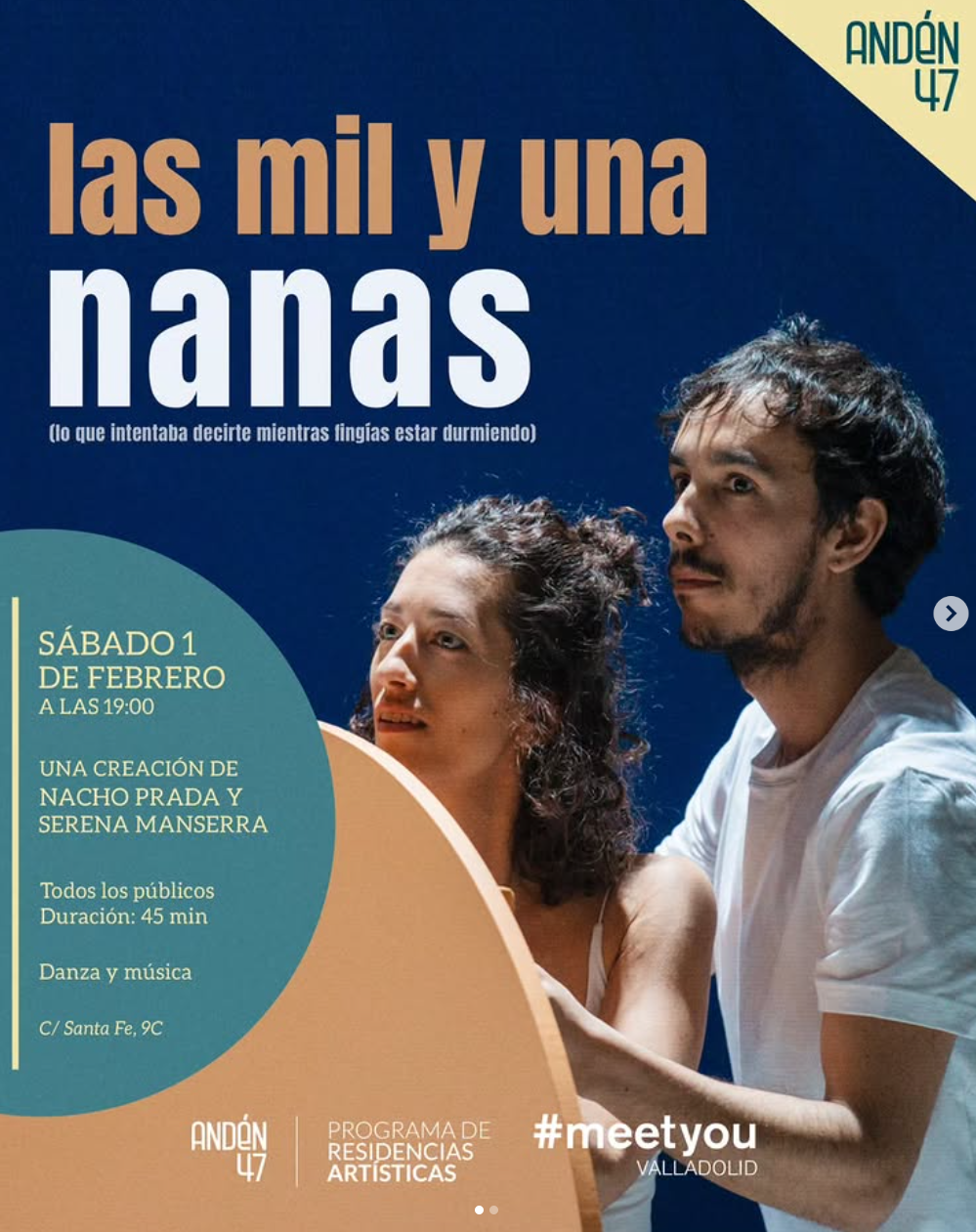 Las mil y una nanas. Una pieza que aúna el gesto, la danza y la música en directo para relatar e investigar lo que hay alrededor de las canciones de cuna, las nanas. Tomando como punto de partida el mundo del insomnio, con sus ovejas infinitas que parecen atormentar a aquél que lo sufre, hasta llegar a tratar la nana, ese canto de amor y lamento que nos hace a todas conectar con una raíz muy ancestral, un abrazo que arropa y un balanceo lento.