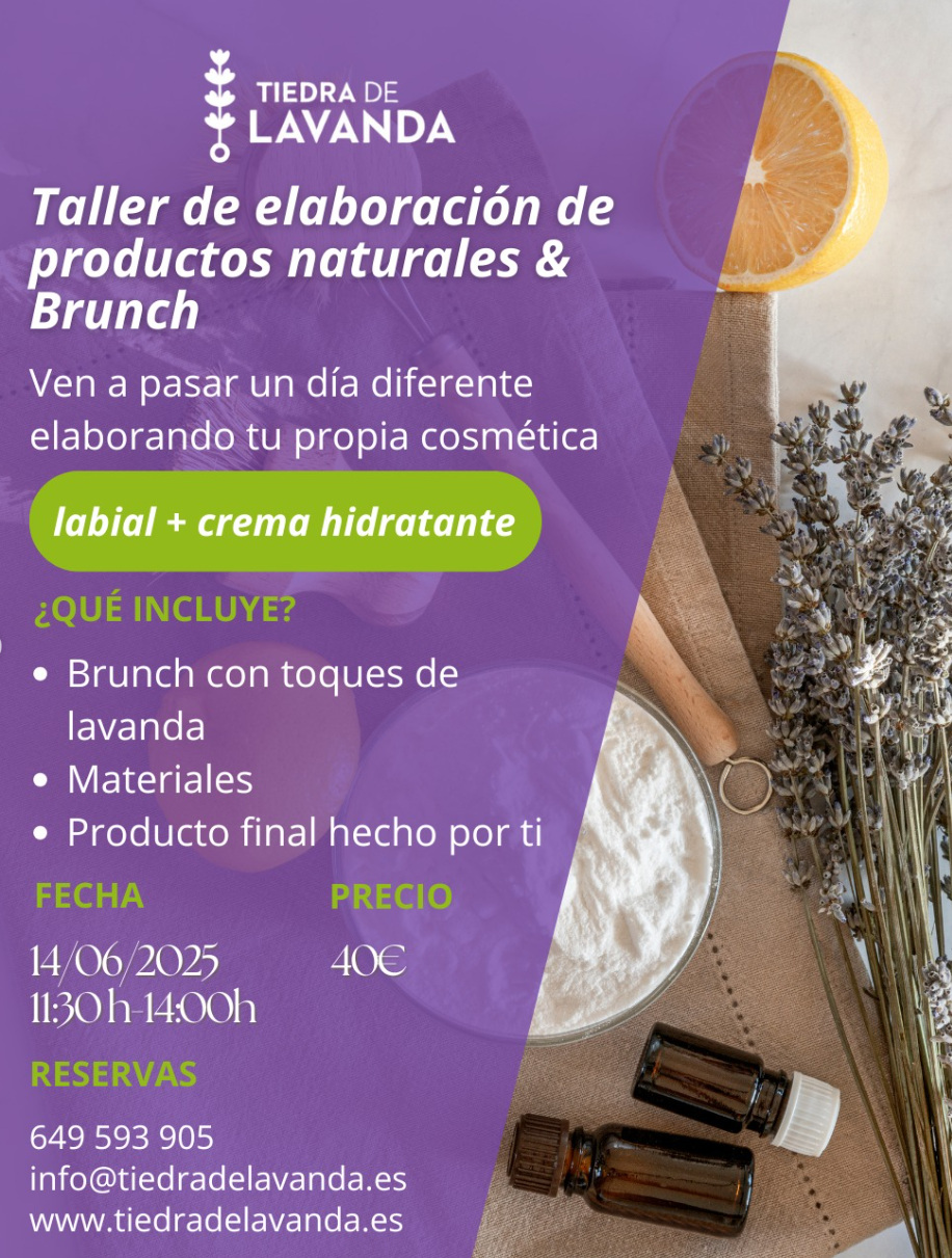 Taller de elaboración de productos naturales (labial + crema hidratante) + brunch. Incluye brunch con toques de lavanda, materiales y producto final hecho por ti.