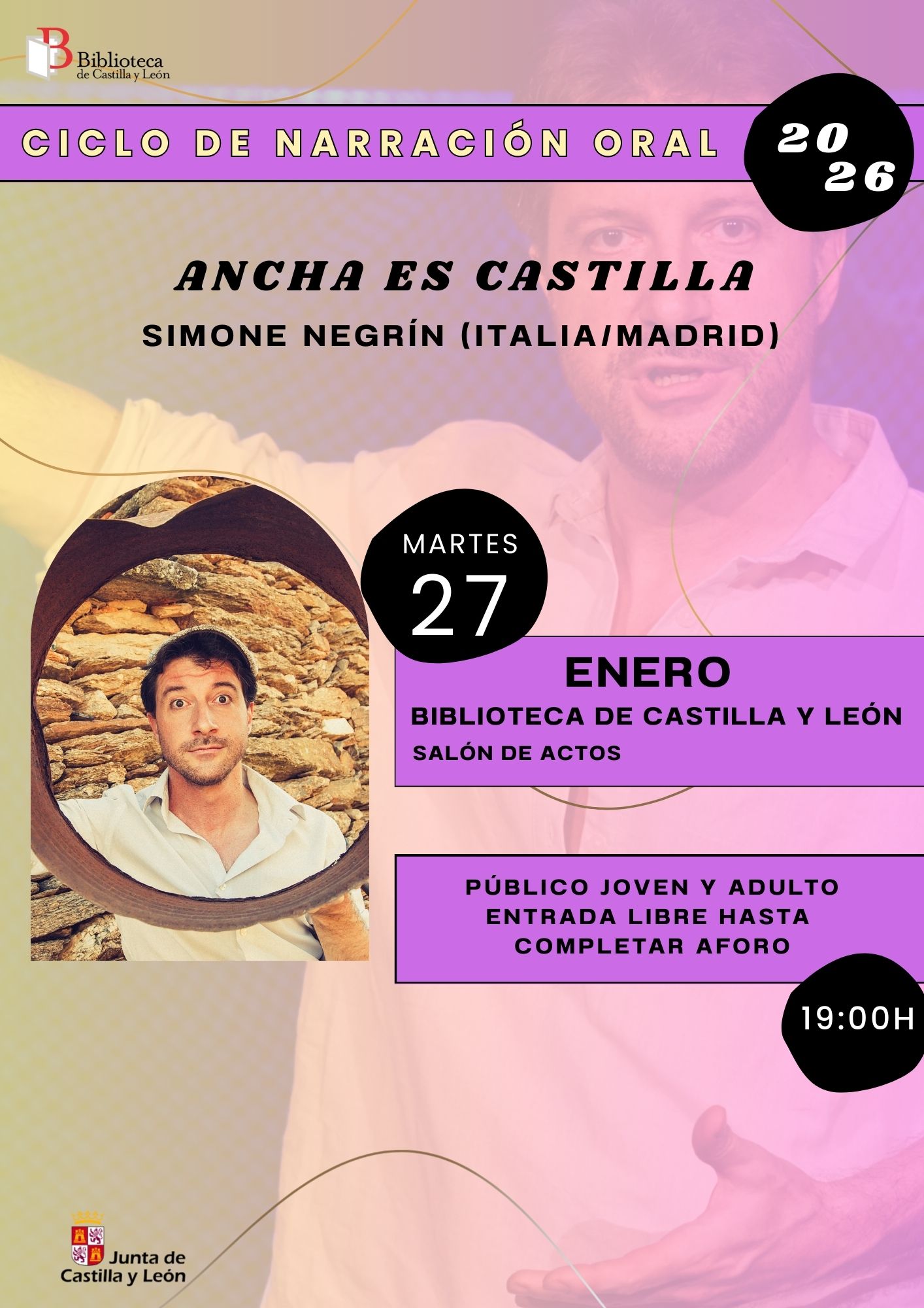 La primera sesión del 2026 del Ciclo de Narración Oral estará a cargo de Simone Negrín. Narrador, teatrero y pedagogo italiano, residente en España desde 2002. Ha sido actor, director, guionista, improvisador, presentador de televisión y enseñante de gesticulación italiana. Su camino como narrador empezó en los conciertos didácticos de la Real Filharmonia de Galicia. ...